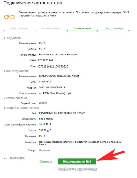 За день до списания на Ваш телефон к которому подключен Мобильный банк придет СМС с номера 900 о том , что завтра с Вашего счета произойдет списание установленной Вами в автоплатеже суммы и в случае согласия на платеж –ничего делать не нужно на следующий день произойдет списание денежных средств в пользу компании РЦТК на ваш лицевой счет, а в случае отказа от платежа достаточно будет отправить на номер 900 код указанный в СМС.